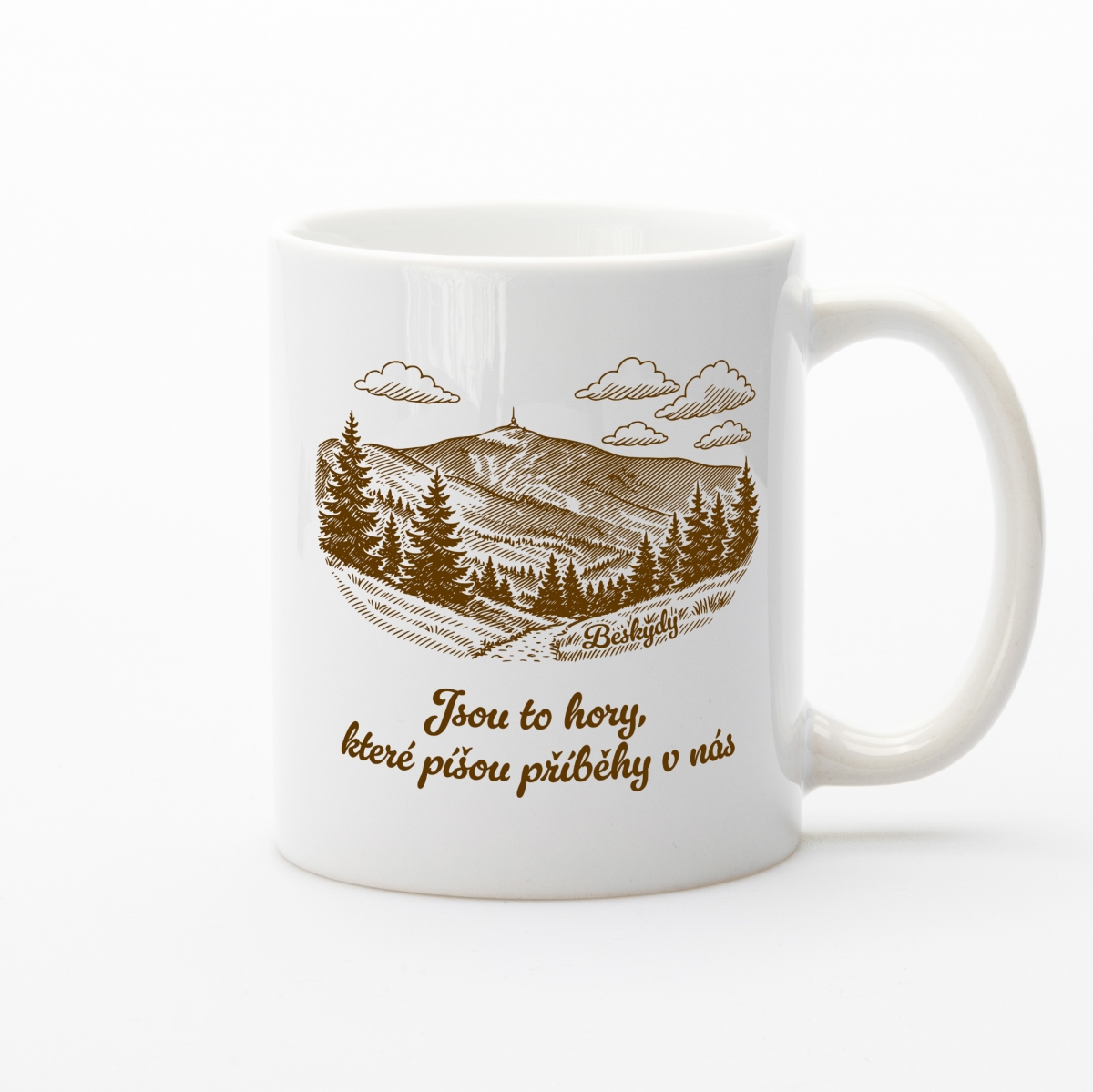 Na jeho jemně bílém povrchu vyniká detailní ručně kreslená hnědá ilustrace beskydských kopců, s výraznou dominantou Lysé hory a lesů v popředí. Motiv působí nostalgicky, laskavě a nese v sobě atmosféru odpolední horské pohody. K tomu přidaný citát „Jsou to hory, které píšou příběhy v nás“ vytváří hřejivý prostor pro myšlenky, které člověk nechává v horách — a které si teď může nést i domů.