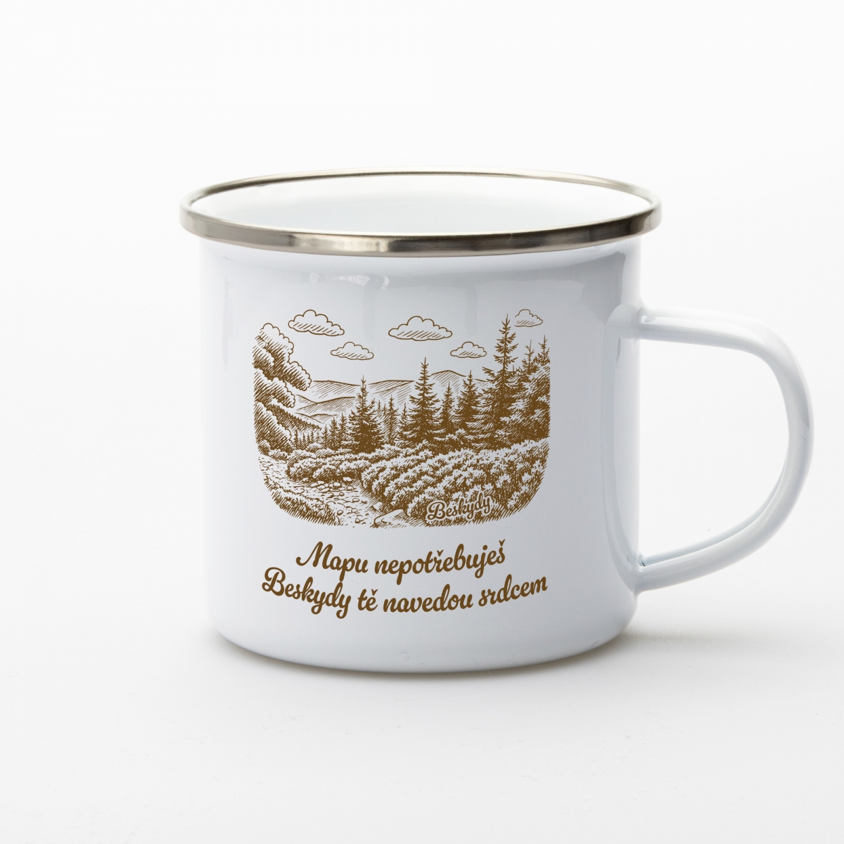 Na bílém smaltovaném povrchu se vyjímá jemná hnědá ruční ilustrace beskydské krajiny. Cestička lemovaná smrky, kopce v dálce, obláčky nad horizontem — motiv působí hřejivě, poeticky a připomíná pomalý krok lesem, kdy si člověk dovolí jen být. Stříbrný lem dodává hrnku čistotu a ušlechtilý horský detail.