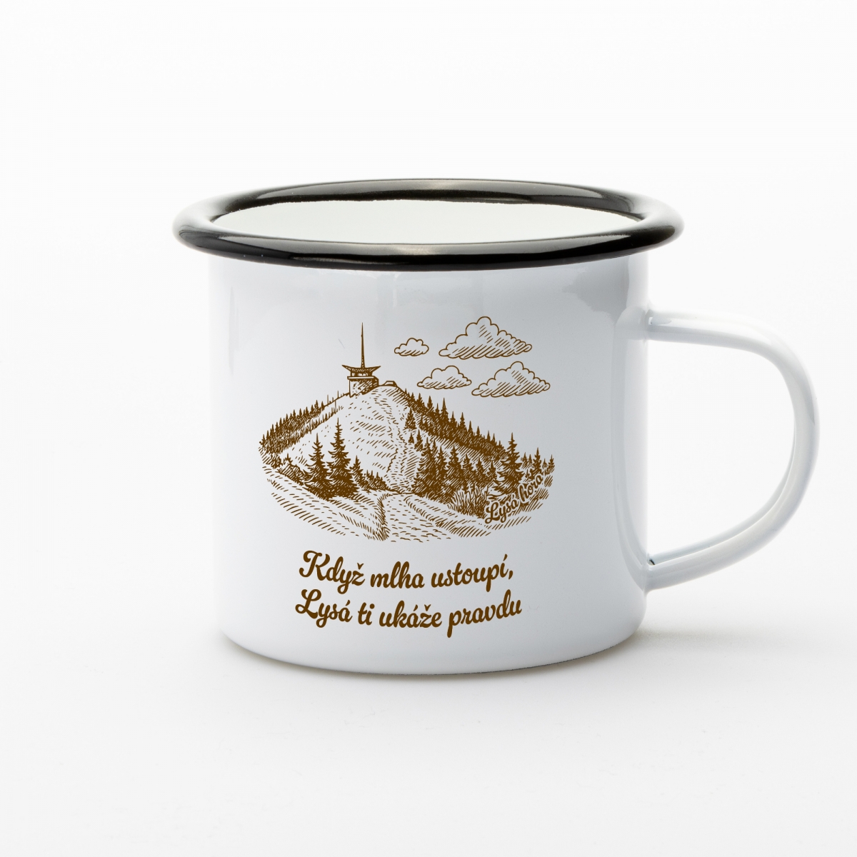 Na bílém smaltovaném povrchu se krásně vyjímá ručně kreslená hnědá ilustrace Lysé hory s vysílačem, okolními lesy a cestičkou, která připomíná každý jeden krok výstupu. Ilustrace působí hřejivě a nostalgicky, jako vzpomínka na výlet, který ti zůstal v srdci.