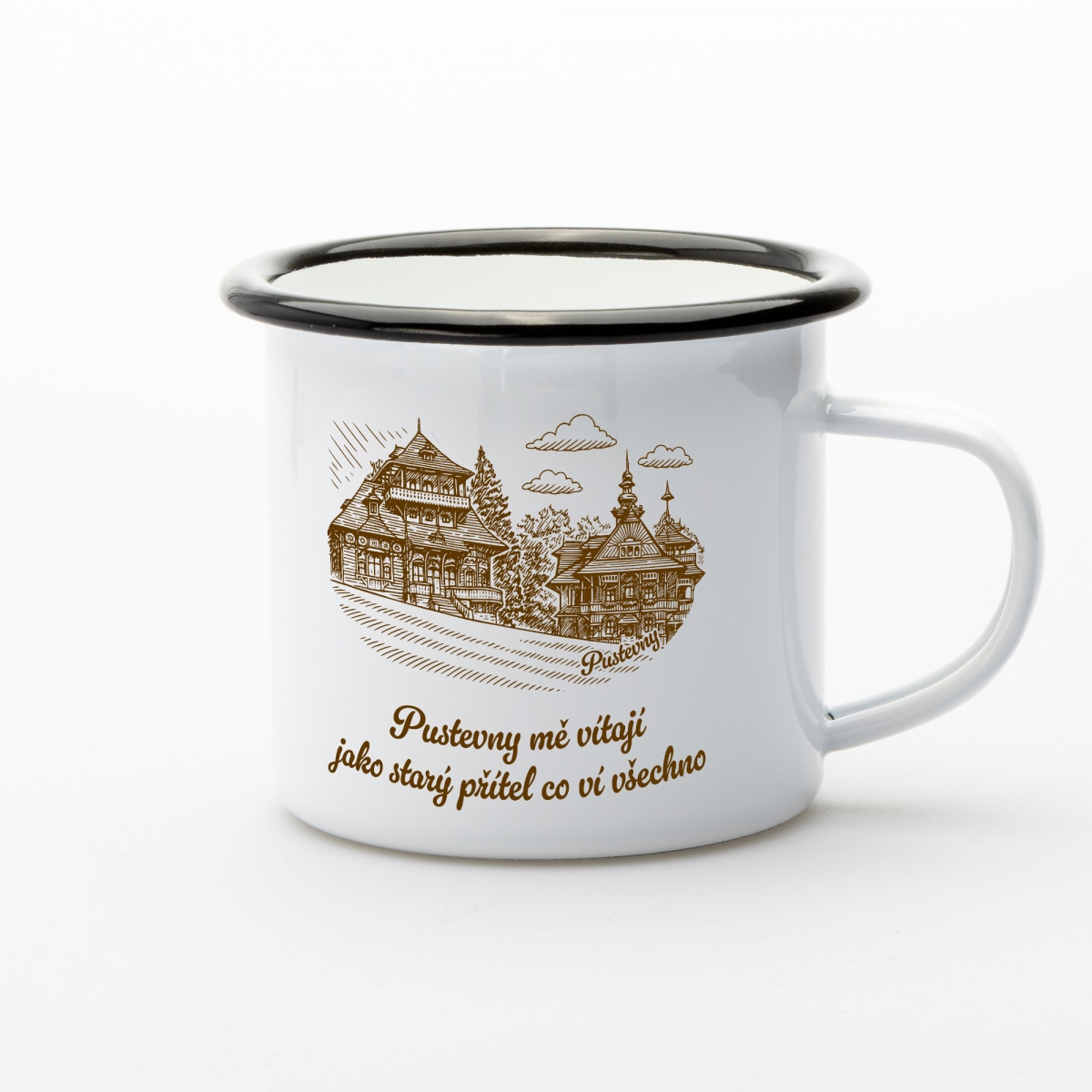 Na bílém smaltovaném povrchu plecháčku se vyjímá jemná hnědá ruční kresba Pusteven, zachycující jejich ikonickou architekturu s obdivuhodným detailem. Vzdušné oblaky nad scénou dodávají ilustraci lehkost a malebnost, jako by se celé Pustevny nadechly a přivítaly tě zpět.